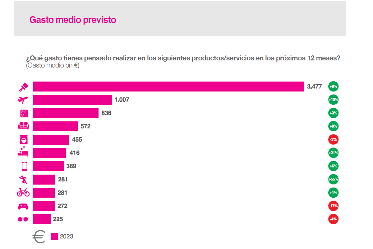 En cuanto al gasto medio realizado por los compradores españoles en los últimos 12 meses, se aprecia un incremento de gasto en el sector viajes (991 euros de gasto medio) con un crecimiento de un 32% con respecto al 2021, el sector deportes con 182 euros de gasto medio en 2022 (+17% vs 2021) y el sector bike con un crecimiento del 13%, situándose en 353 euros de media.