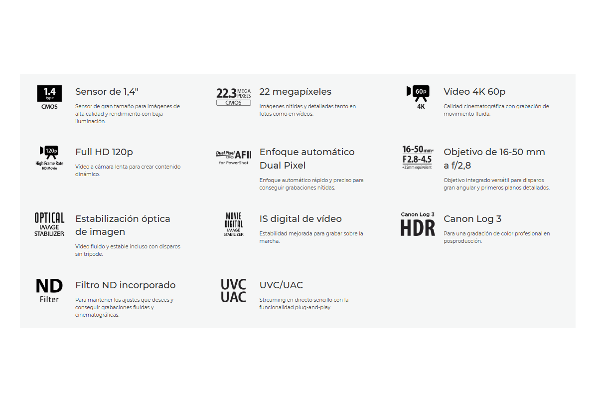 La Canon PowerShot V1 es una cámara orientada al vídeo, compacta y ligera, que está diseñada para crear contenido de forma sencilla estés donde estés. Ofrece funciones de vídeo avanzadas y un manejo intuitivo, ideal para capturar momentos cuando la inspiración llega. Equipada con un gran sensor de 1,4" y un objetivo ultra gran angular f/2.8 integrado, proporciona imágenes nítidas y de alta calidad. Además, su excelente rendimiento de audio la convierte en una herramienta versátil, perfecta para grabar contenido dinámico en cualquier lugar.