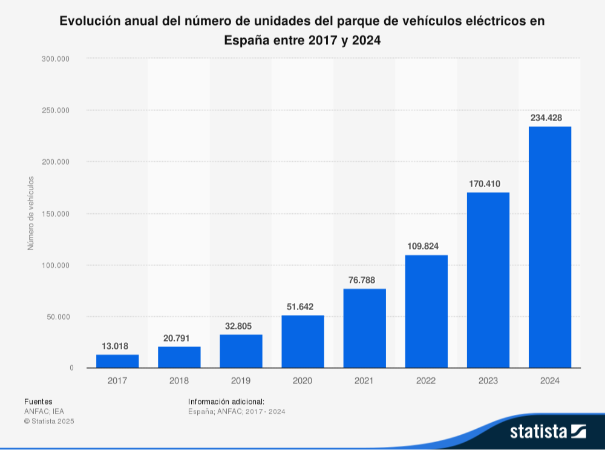 Los vehículos eléctricos vendidos en España en 2024 alcanzaron la cifra de 234.428 unidades. Estos datos reflejan un incremento del 37,57% respecto al año anterior, una evolución que sigue su tendencia año tras año y que augura un buen futuro para este producto.