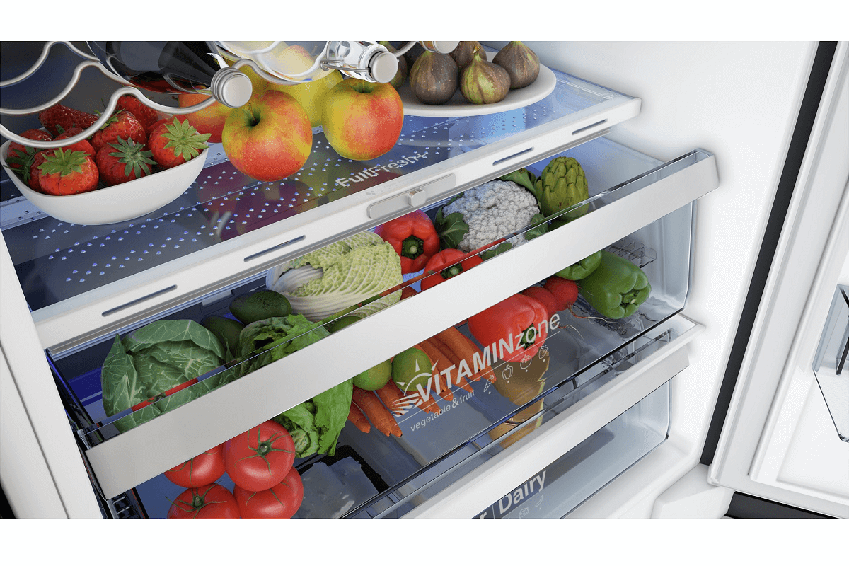 1. FullFresh+: Un cajón especialmente diseñado para minimizar la condensación y mantener unas condiciones de humedad y temperatura óptimas. Gracias a un sistema de circulación del aire controlado, las frutas y verduras permanecen frescas y deliciosas hasta tres veces más tiempo que en un cajón convencional. De esta forma, la tecnología FullFresh+ te ayuda a desperdiciar menos alimentos y que tus compras sean más eficientes.