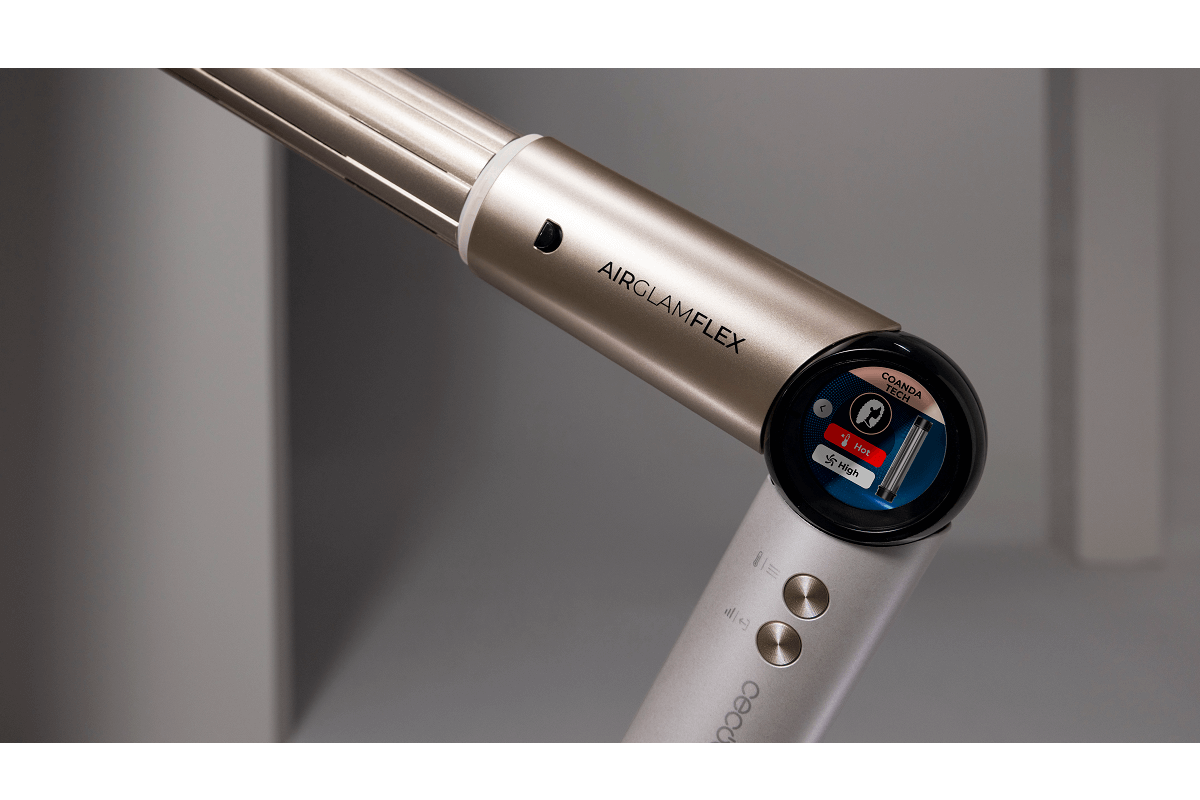 Destaca el efecto Coanda que consigue con sus cuatro cilindros rizadores, de 32 mm y 38 mm para el lado izquierdo y de 32 mm y 38 mm para el derecho, diseñados para atraer y envolver cada mechón con aire caliente, dándoles la forma deseada en cuestión de segundos.