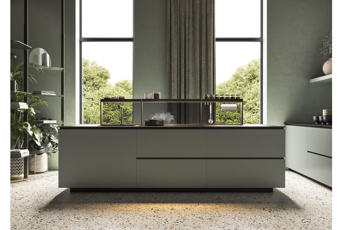 Completa la estructura una iluminación dinámica y regulable que permite cocinar con el máximo confort visual, creando al mismo tiempo un ambiente acogedor en la cocina.