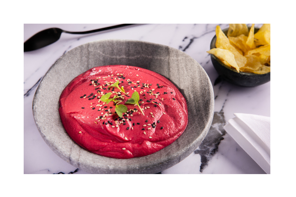 1. Hummus de remolacha con chips de patatas fritas: Una versión colorida y llena de energía del clásico hummus, en la que la remolacha cocida aporta un tono rosado intenso y un sabor ligeramente dulce. La textura cremosa se consigue gracias a la mezcla de garbanzos, tahini, limón y aceite de oliva virgen extra. Se sirve con chips de patatas fritas que hacen de "cucharas comestibles" y se puede rematar con una pizca de pimentón de la Vera para realzar el sabor.