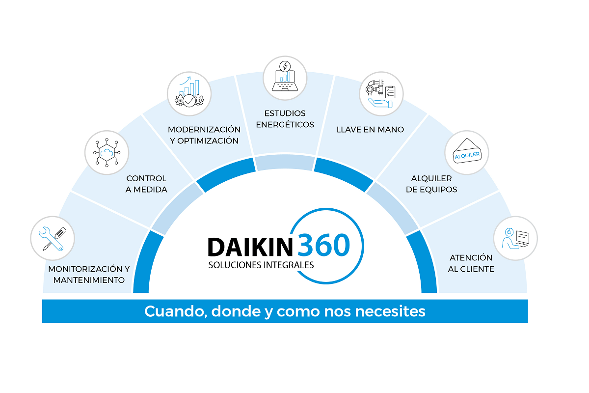 Un nuevo enfoque integral. En un contexto en el que la eficiencia energética, la fiabilidad y la responsabilidad ambiental son más necesarias que nunca, los clientes demandan algo más que equipos de alto rendimiento: buscan soluciones globales y a largo plazo. Daikin360 nace precisamente para dar respuesta a esa necesidad, ofreciendo un conjunto de servicios, soluciones integradas y tecnología que abarcan todas las fases de sus sistemas de climatización y edificaciones inteligentes; yque combinan la innovación tecnológica con el soporte técnico más avanzado, asegurando la continuidad, la eficiencia y la máxima rentabilidad de las instalaciones.