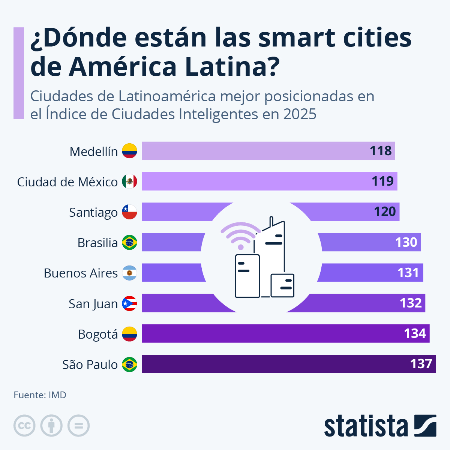La ciudad de América Latina que logra una mayor puntuación en el ranquin de ciudades inteligentes fue Medellín. Según este estudio de IMD, en el que se tienen en cuenta no solo los elementos tecnológicos de la ciudad sino también la infraestructura y la calidad de vida de su población, se ha dado el reconocimiento a esta ciudad colombiana con la primera posición del continente. Esta posición número 118 supone un ascenso de un puesto con respecto a los resultados obtenidos en 2024.