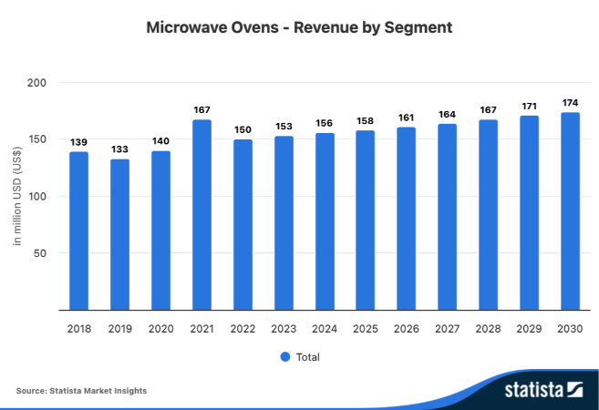 En finalizar este año 2025 y según los datos previstos en este estudio se calcula que para 2025 se alcancen los 158 millones de dólares de ingresos en la venta de microondas. Esto supondría una mejoría de un 1,8% respecto al año anterior.