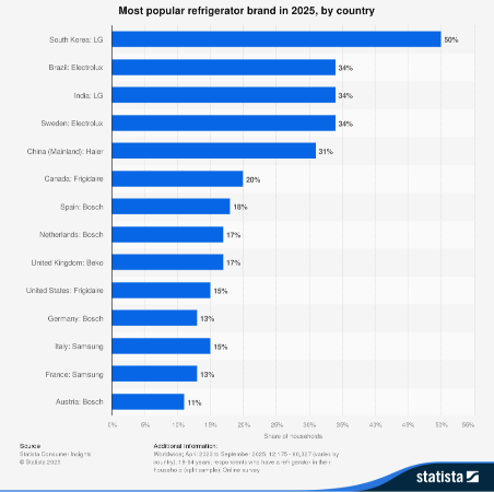 Estos datos obtenidos por Statista Consumer Insights revelan cómo países como Corea del Sur tienen clara su opción favorita mientras otros como Austria tienen opiniones más diversas a la hora de determinar su marca preferida de frigoríficos.