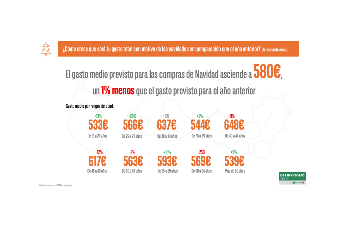 El gasto medio previsto se sitúa en 580 euros, frente a la cifra de 583 euros en 2024, lo que refuerza la idea de una campaña navideña sin grandes alteraciones respecto al año anterior. Si segmentamos por edades, los españoles de 40 a 44 años destacan notablemente con un gasto medio previsto de 648 euros, un 12% más que la med.