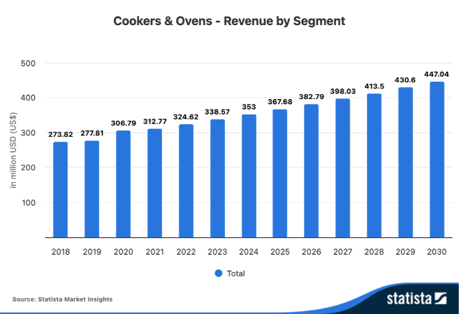 La evolución del sector va a ser progresivamente mayor año tras año. Según la información proporcionada por Statista en 2029 se alcanzarán los 430,6 millones de dólares en la venta de hornos y cocinas completas mientras que para 2030 estos datos podrían elevarse hasta los 447,04 millones. Esto supone un incremento de hasta 16,44 millones de dólares en un año de diferencia. Se trata del mayor incremento que se espera para los próximos años.