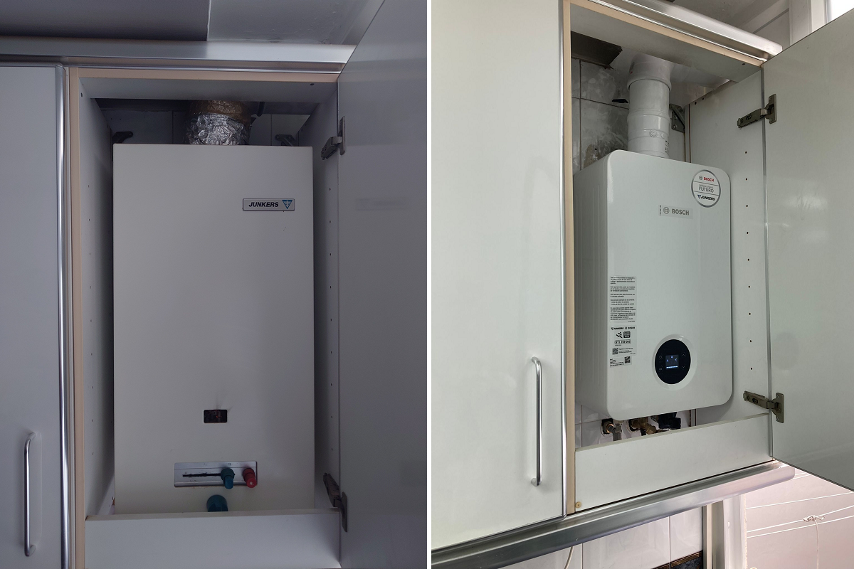 FOTO PRINCIPAL.: De izq. a drcha.: calentador original Junkers W325 KV de butano. Dcha. Nuevo calentador Bosch Therm 6600 S.