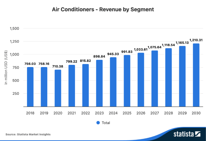Los fabricantes de aires acondicionados seguirán incrementando sus ingresos en los próximos años. De hecho, ya en 2027 se espera que la cifra se acerque a 1,1 mil millones de dólares y ya en 2028 se superará por primera vez llegando hasta los 1,12 mil millones de dólares ingresados por la venta de estos aparatos aclimatadores.