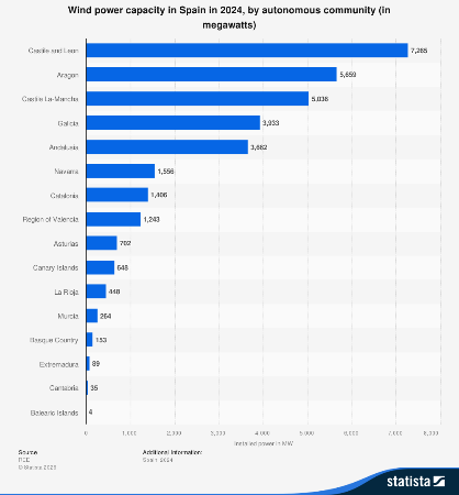 Otras comunidades autónomas como Asturias, Islas Canarias o La Rioja se encuentran por debajo de los 1.000 MW y solo Extremadura, Cantabria y las Islas Baleares se encuentran por debajo de los 100 MW de potencia eólica instalada.