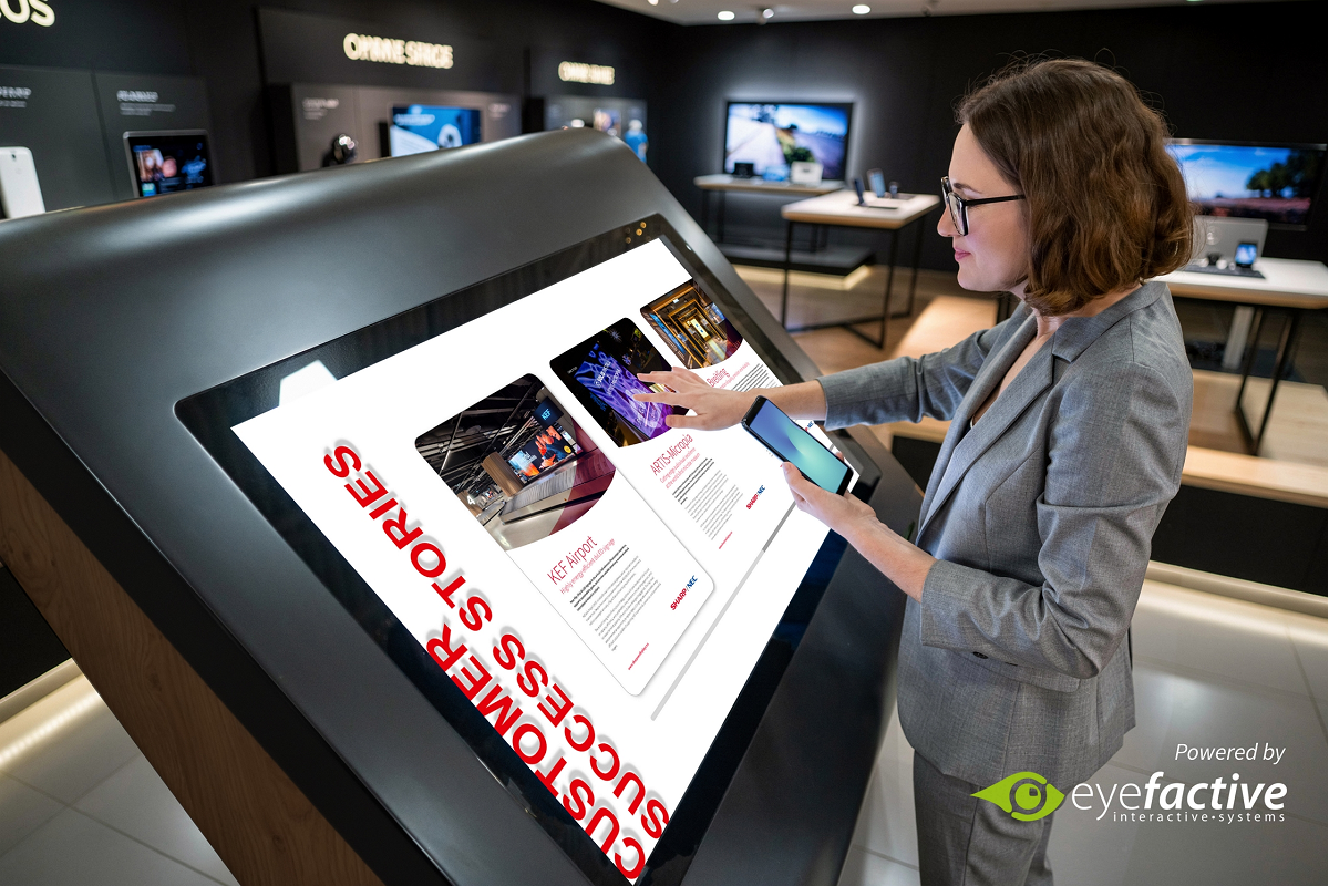 Uno de los elementos centrales del stand será una aplicación interactiva desarrollada sobre una mesa táctil PCAP de 55", creada en colaboración con la empresa especializada en software interactivo eyefactive GmbH. Esta instalación permitirá a los visitantes explorar de forma intuitiva el catálogo de productos y soluciones de Sharp mediante una experiencia de navegación multitáctil.