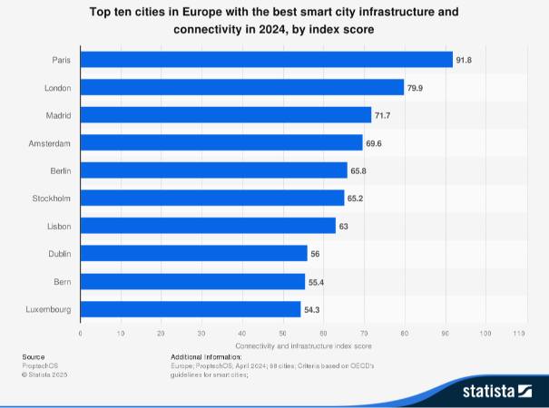 La ciudad francesa consiguió situarse como la mejor ciudad inteligente en el campo de la infraestructura con una nota de 91,8 puntos dejando muy atrás al resto de ciudades europeas que no consiguieron ni alcanzar los 80 puntos.
