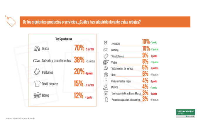 A pesar de este descenso, la ropa sigue siendo el producto más adquirido durante las rebajas de 2026. En concreto, siete de cada diez españoles afirma haber comprado este tipo de artículos. Le siguen el calzado y los complementos, con un 38%, mismo porcentaje al año anterior; los perfumes, con un 20%, un punto menos que en 2025; el textil y calzado deportivo, con un 15% frente al 18% de 2025, y los libros, con un 12%, un punto por debajo al año 2025.