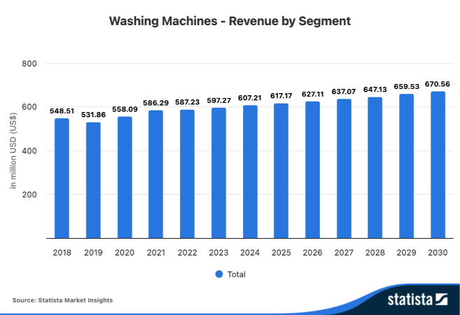 Si no hay ningún contratiempo inesperado, para el año 2030, la venta de lavadoras podría alcanzar los 670 millones de dólares. Estos datos se alcanzarán progresivamente año tras año. Para este 2026 se esperan alcanzar unos datos de 627,11 millones de dólares, lo que supone un incremento de un 1,61% respecto al año anterior, cerca de 10 millones de dólares de diferencia respecto al 2025.