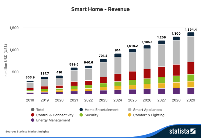 Solo en la venta de electrodomésticos inteligentes en España ya se sumó en el recién finalizado año cerca de 430 millones de dólares, lo que supuso algo más del 40% de los ingresos totales. En total para 2025 se llegaron a sumar unos ingresos derivados de la venta de equipamientos para las Smart Home de hasta 1,018 millones de dólares. Se trata del primer año en superar los mil millones de dólares en este campo. El año anterior de habían ingresado unos cien millones menos con un total de 914.