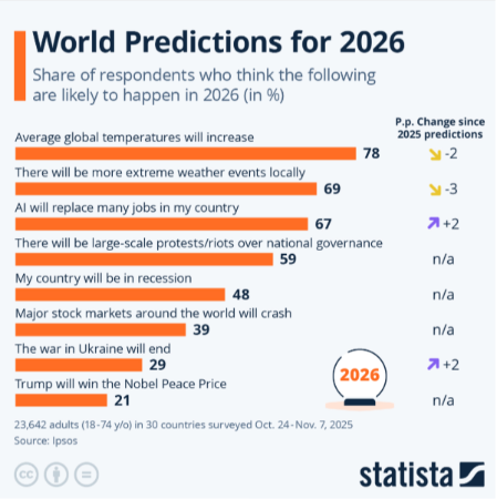 Según el informe, el 67% de la población mundial considera que la IA eliminará varios puestos de trabajo en su país. De hecho, esta premisa es la tercera que más consenso genera en la sociedad y la que más crece respecto al año anterior. Tan solo el consenso sobre el calentamiento global (78%) y el auge de los fenómenos meteorológicos (69%) cuentan con un porcentaje de apoyo superior a la creencia de que la IA incidirá negativamente en los mercados laborales del mundo.