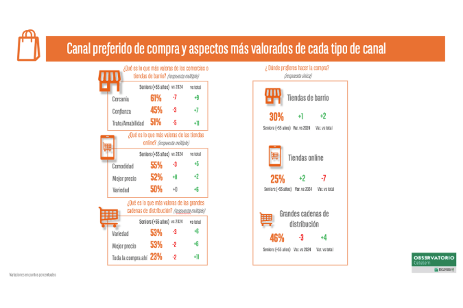 Los consumidores mantienen una clara preferencia por la tienda física, incluyendo tiendas de barrio, grandes superficies especializadas, grandes almacenes y tiendas medianas o grandes de barrio. Las tiendas de barrio destacan por su cercanía, trato personalizado y atención directa, mientras que las grandes superficies especializadas son las más utilizadas para productos tecnológicos, muebles, descanso y deporte.