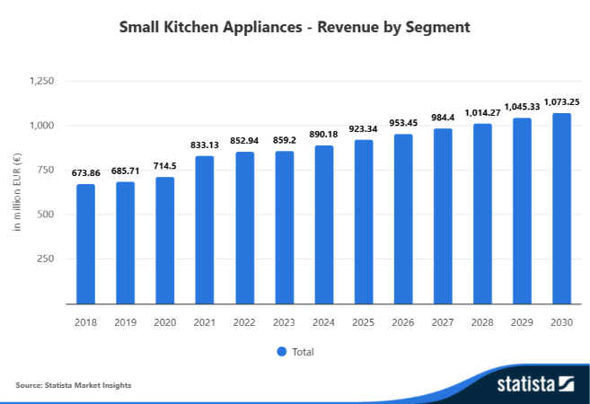 El mercado español de pequeños electrodomésticos para cocina cerró 2025 con unos ingresos de 923,3 millones de euros, una cifra que confirma la evolución favorable del sector en términos de facturación. Con un crecimiento del 3,7%, el mercado repitió en 2025 el mismo ritmo de expansión que el año anterior y permite al sector absorber la inflación del ejercicio, que se situó en el 2,9%, según datos publicados por Statista Market Insights.