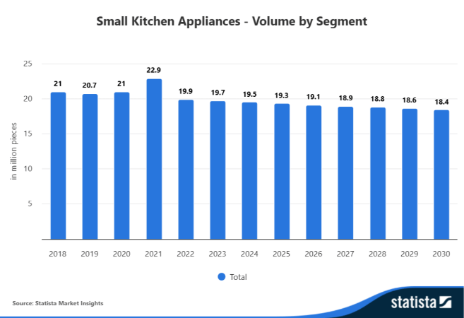 Así, el aumento de los ingresos del mercado se explica principalmente por el encarecimiento de los precios y por una mayor presencia de productos de gama media y alta, y no por un incremento del volumen de ventas. Según las estimaciones de Statista, cada hogar compra, de media, un pequeño electrodoméstico para cocina al año, una cifra ligeramente inferior a la de ejercicios anteriores, cuando el indicador oscilaba entre 1,1 y 1,2 dispositivos por vivienda.