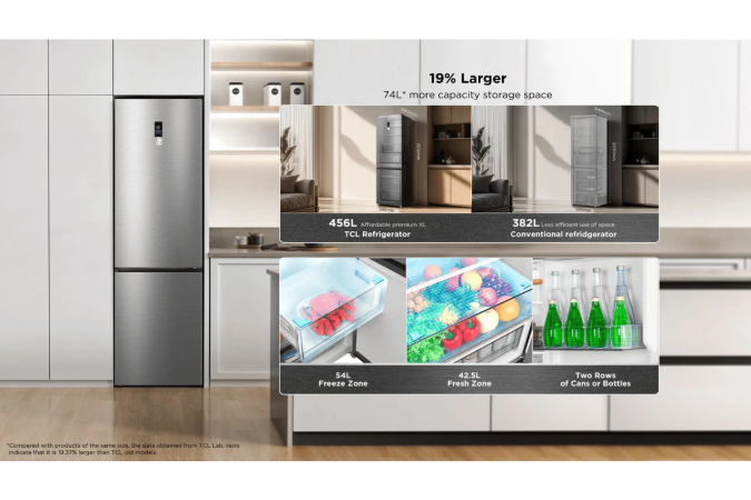 Además de su gama de aires acondicionados, TCL sigue innovando en el hogar con Mega Space™, su línea de frigoríficos combi pensada para maximizar el espacio interior sin ocupar más en tu cocina. Gracias a un rediseño inteligente con paneles de aislamiento de alto rendimiento, Mega Space™ ofrece hasta un 19% más de capacidad, para que puedas aprovechar cada rincón, organizar tus alimentos con facilidad y mantener todo a la vista.