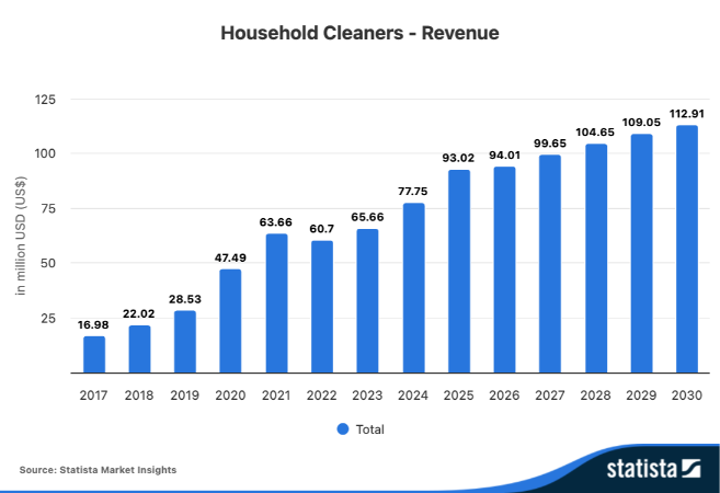 Estos datos recogidos por Statista Market Insights muestran los números reales y las previsiones para los próximos años del gasto en productos de limpieza en los hogares españoles en una horquilla comprendida entre 2017 y 2030.