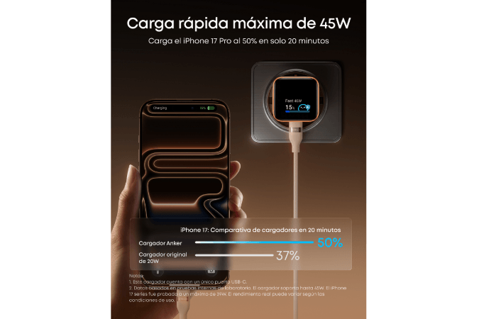 El accesorio Anker Cargador 45W, con pantalla inteligente, se viste de naranja